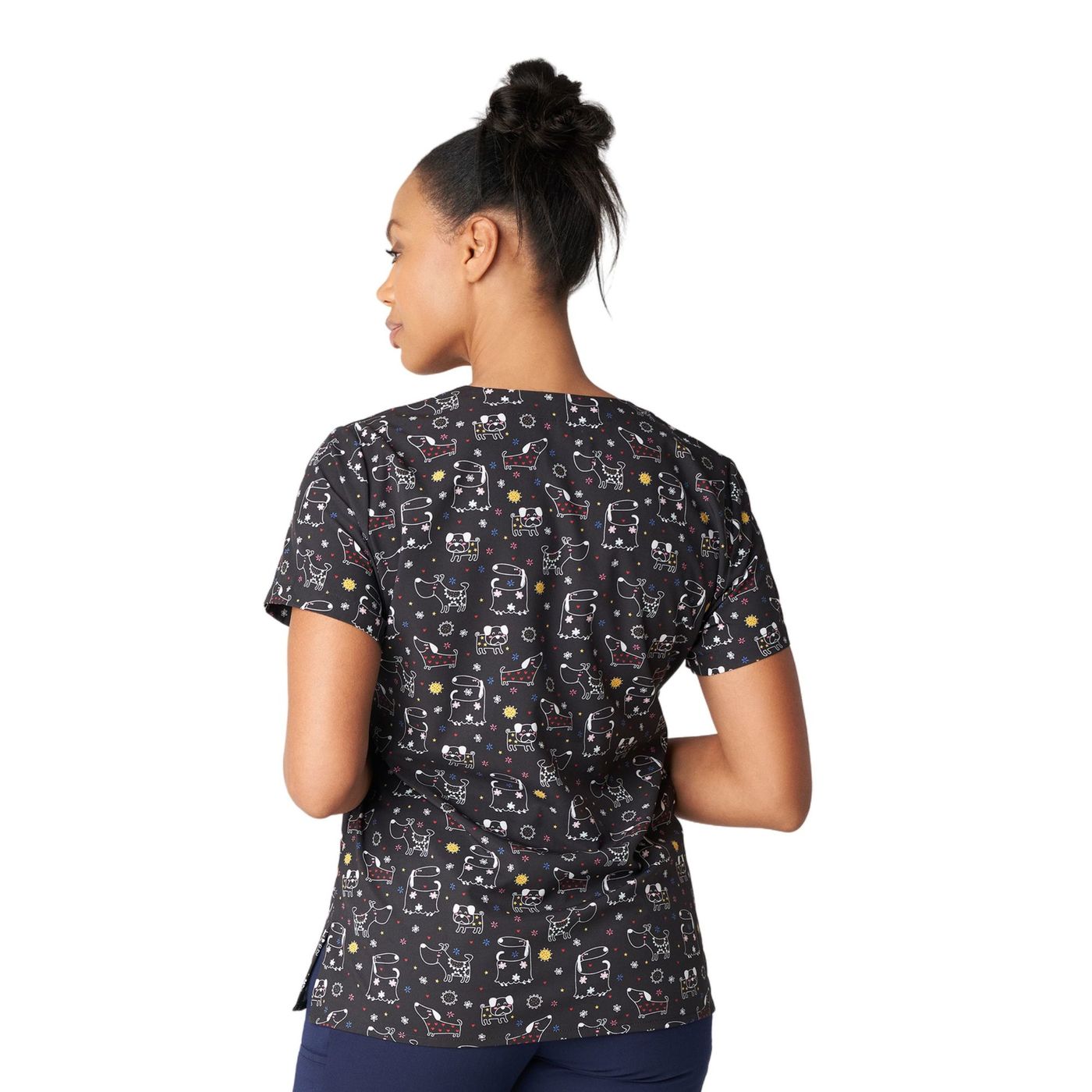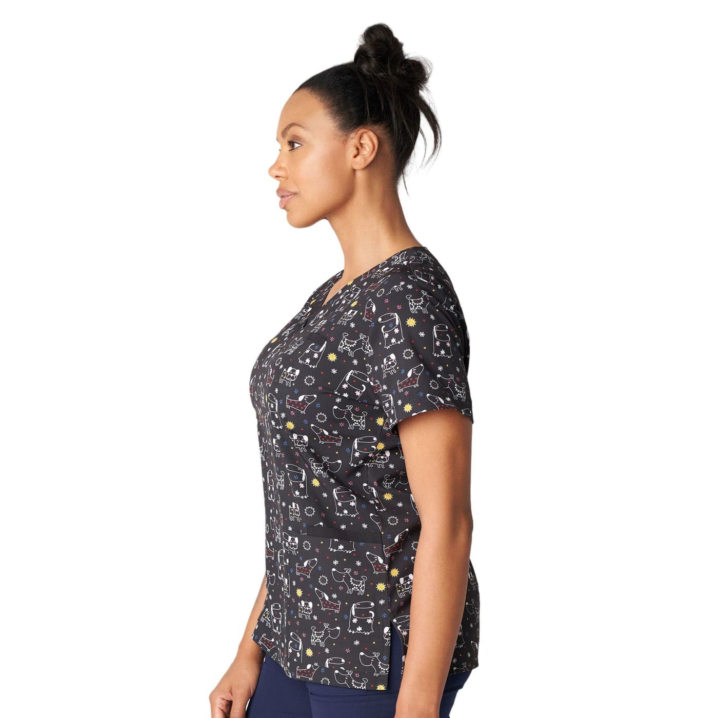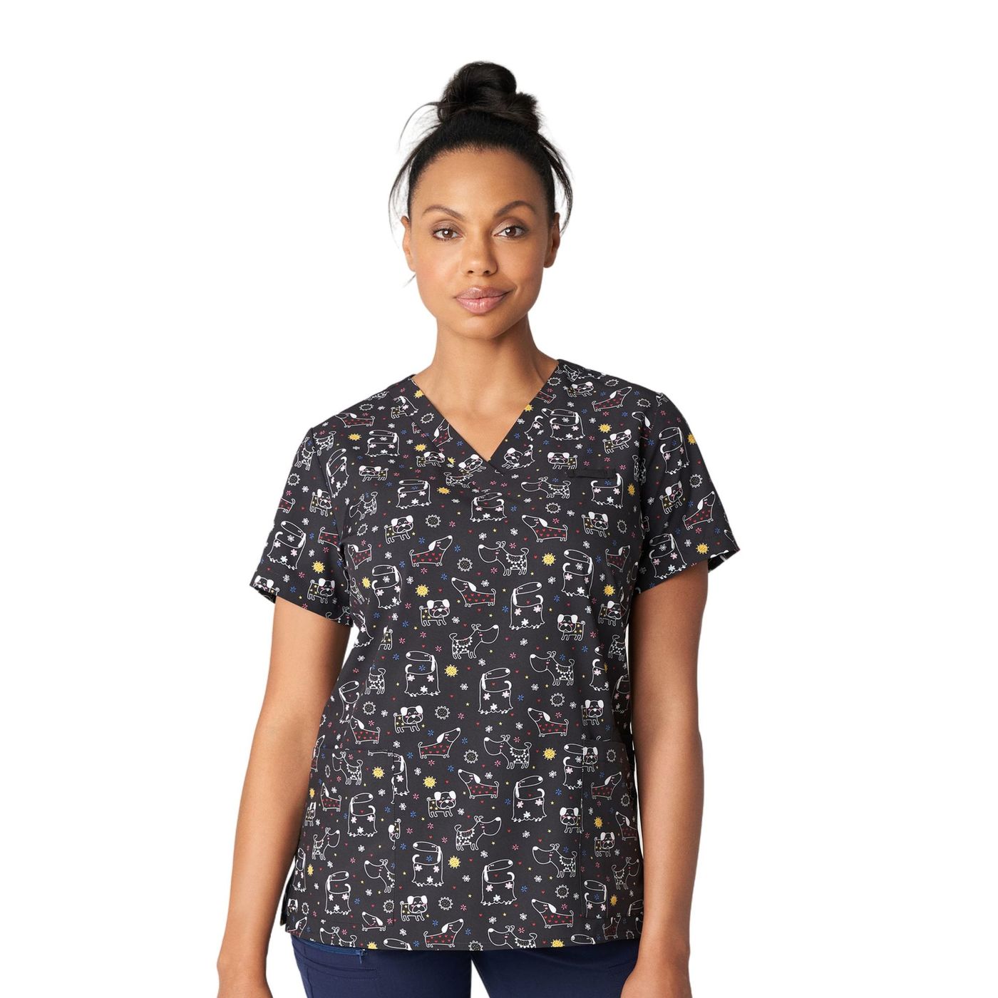 Our women's 3-pocket V-neck scrub top adds both comfort and fun to your work shift with breathable, 2-way stretch for mobility and a silky soft touch for all-day comfort. Created with a V-neck, side vents for extra ease of movement, and a contemporary Slim Fit that's contoured to conform to your body and complement your shape.