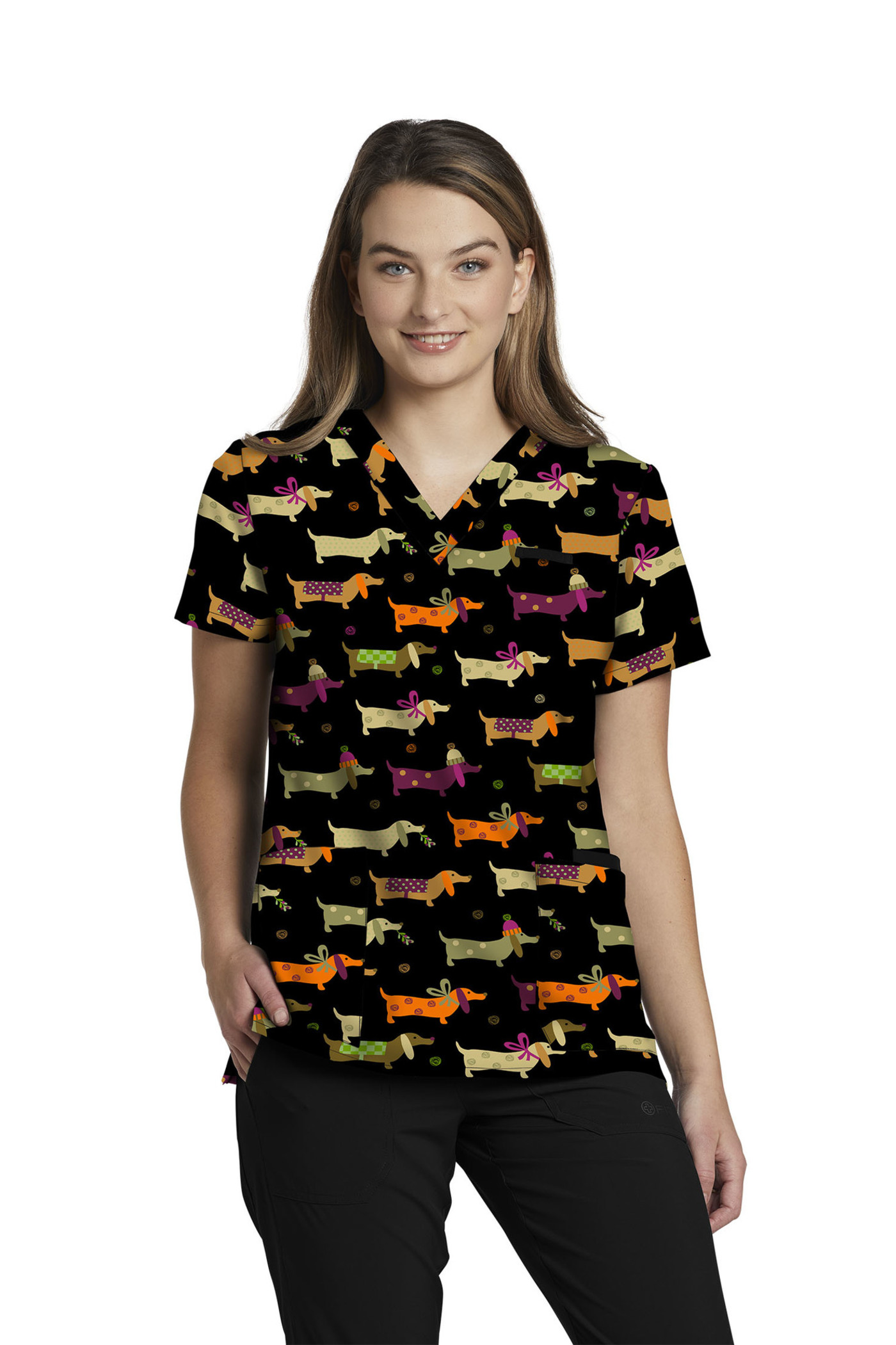 Our women's 3-pocket V-neck scrub top adds both comfort and fun to your work shift with breathable, 2-way stretch for mobility and a silky soft touch for all-day comfort. Created with a V-neck, side vents for extra ease of movement, and a contemporary Slim Fit that's contoured to conform to your body and complement your shape.