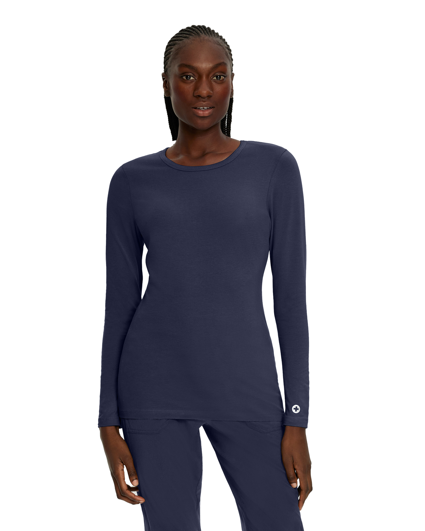 Designed and crafted for exceptional individuals. This breathable, extra soft jersey knit long-sleeve tee is contoured to fit your body and complement your shape. Meant to be worn from day to night, this crew neck under scrub offers 4-way stretch for extra mobility and comfort so you can perform your best at any time. Exceptional quality, exceptional style for exceptional people.
